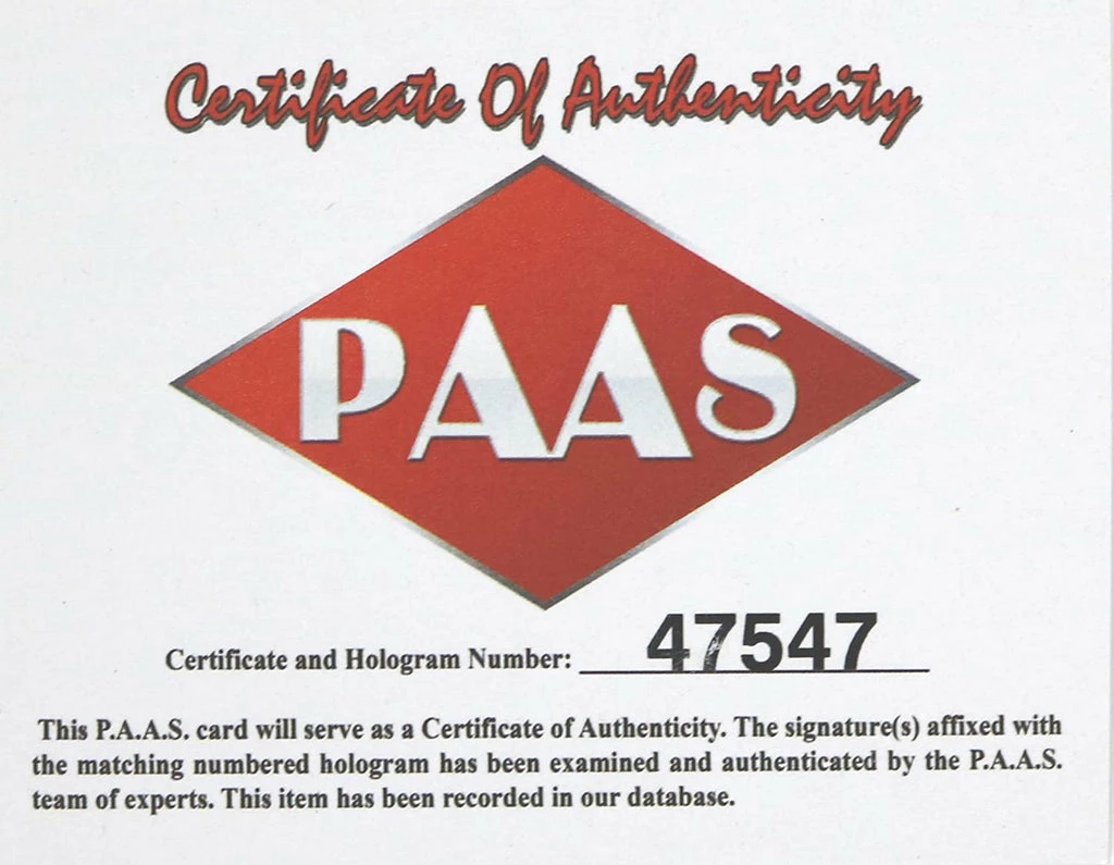 Autographed item comes with Certificate Of Authenticity (COA) Card from PAAS Professional Autograph Authentication Services