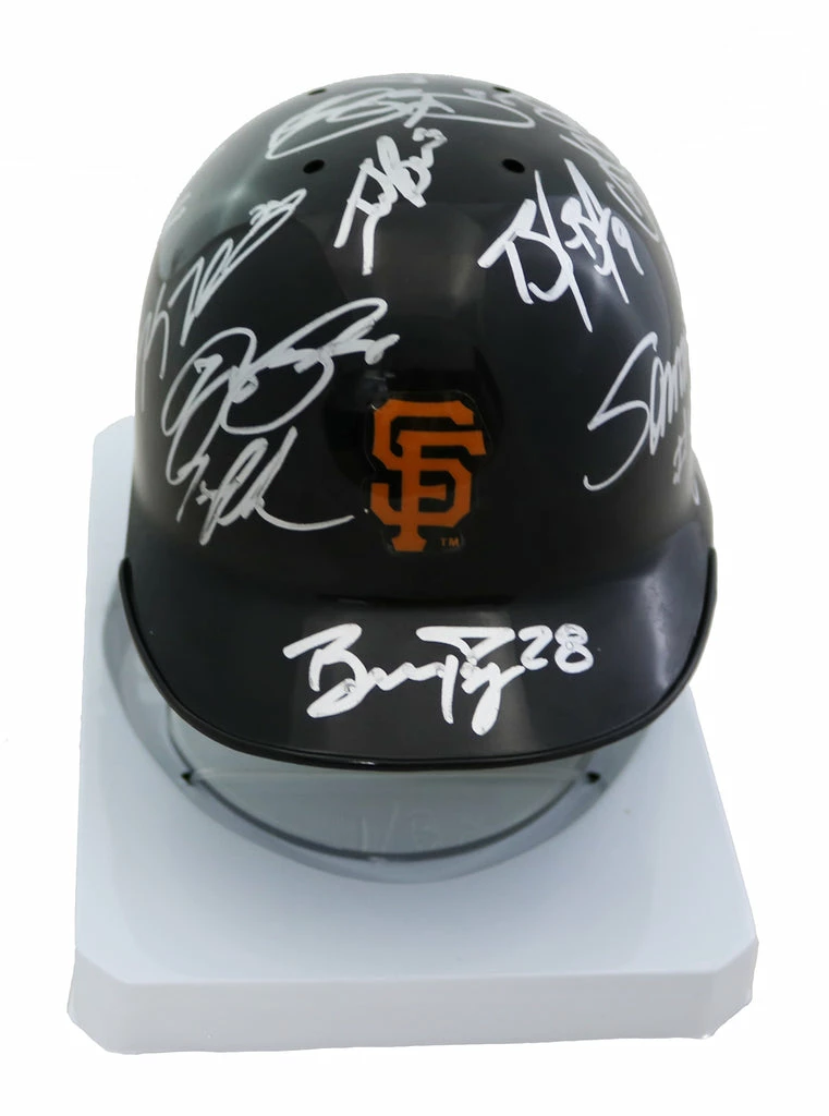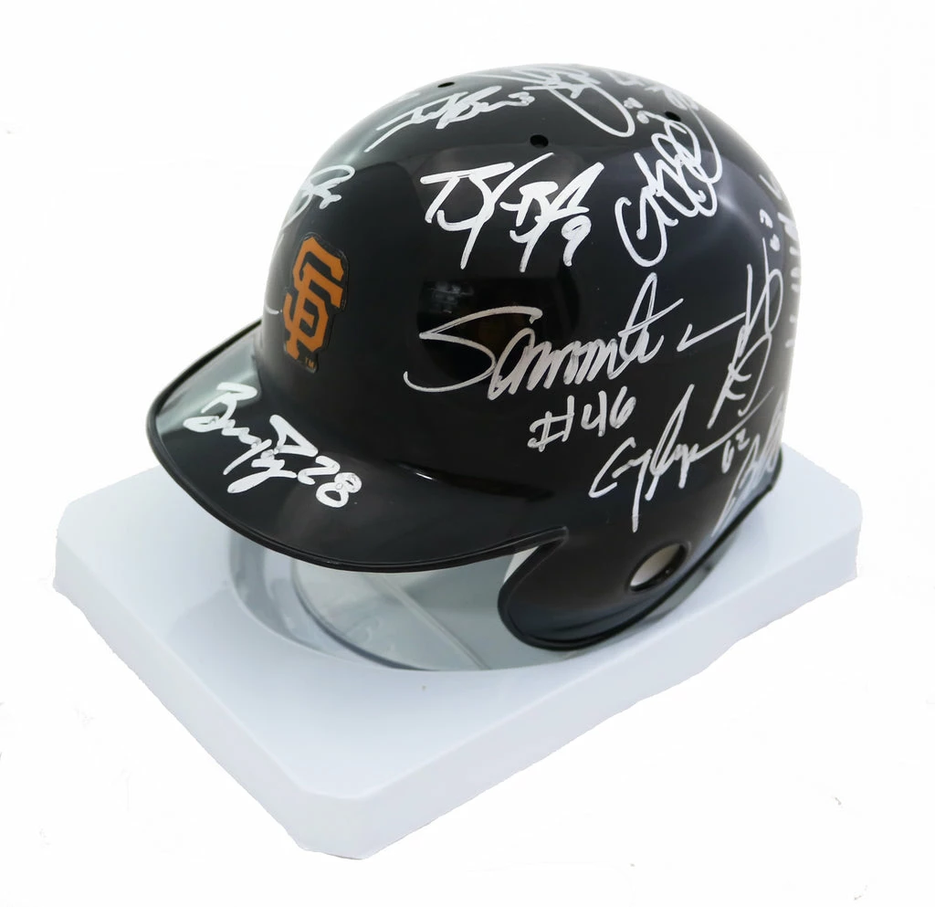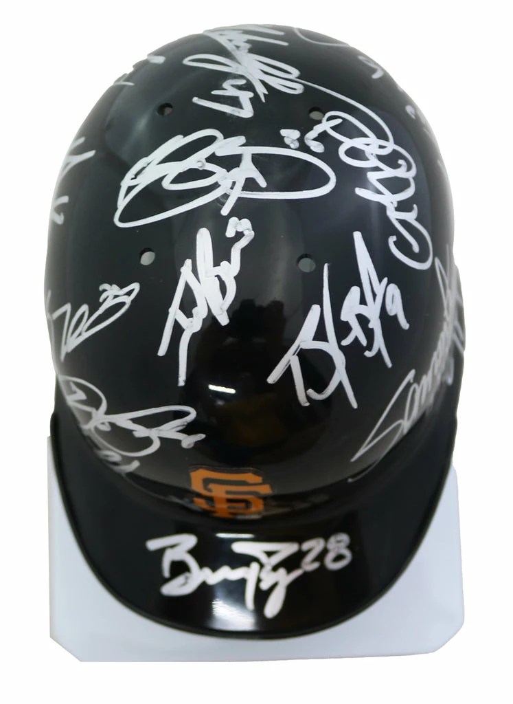 18 Total Signatures including Bruce Bochy, Buster Posey, Madison Bumgarner, Brandon Belt, Brandon Crawford, Joe Panik, Johnny Cueto, Matt Cain, Hunter Pence, Matt Duffy, Santiago Casilla, Hunter Strickland, Grant Green, Kelby Tomlinson, Andrew Susac and Cory Gearrin